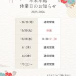 2022年12月5日 / 最終更新日時 : 2022年12月5日 kojika_x31@gmail.com Uncategorized 2022-2023年末年始の営業のお知らせ こんにちは! 亀戸シーシャEightyのぽえです! 年末年始の営業のお知らせです。 2022年12月29日(木)まで通常営業 2022年12月30日(金)~2023年1月1日(日)の間おやすみ 2023年1月2日(月)よ […]